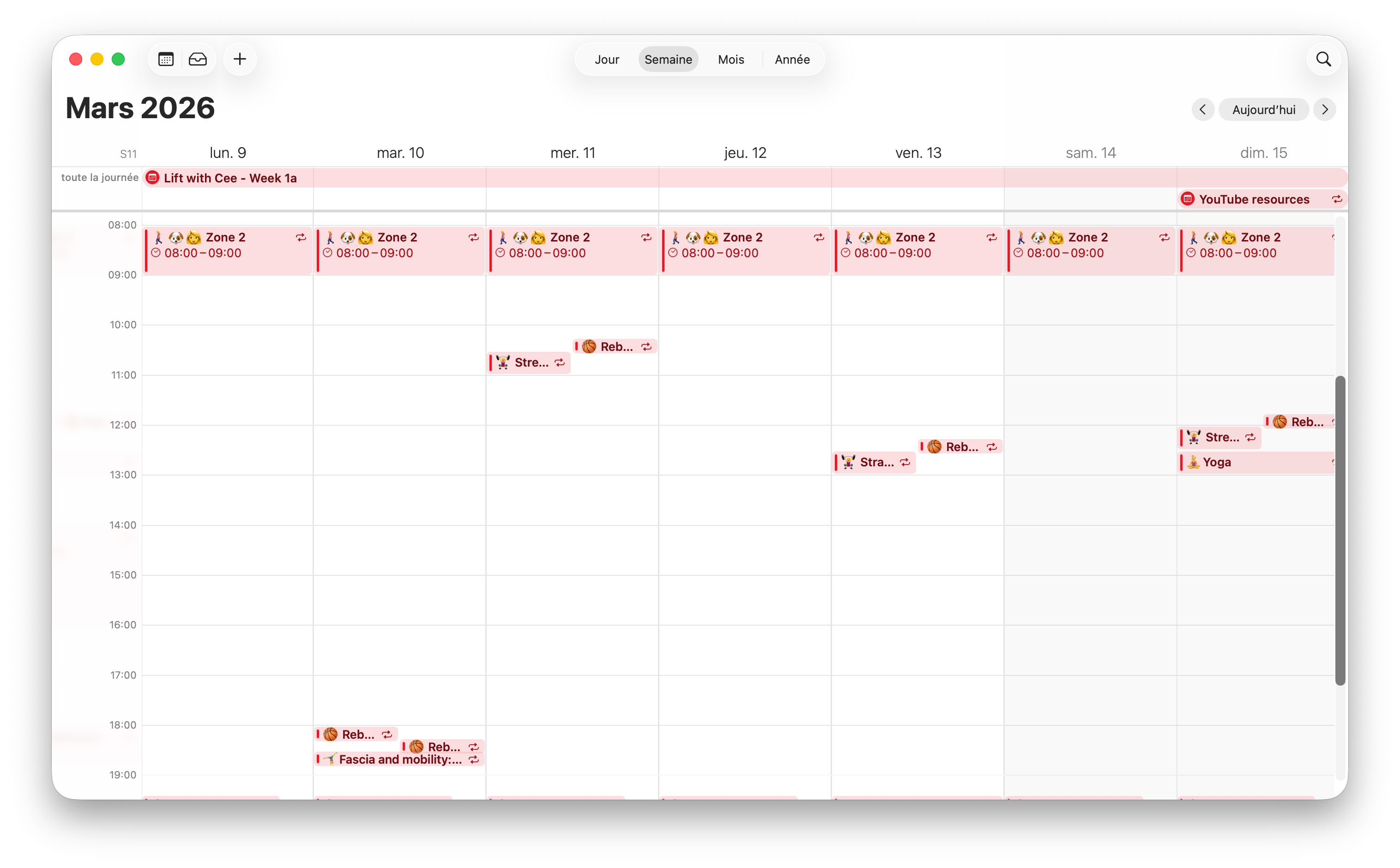 42 weekly events, set up once a year. For strength training, I create a recurring weekly event for each workout in the Lift with Cee rotation. Each event has the title of that week’s session and the direct link to the video embedded in the notes. Set up 42 of these at the start of the year and you are done. No searching, no deliberating, no friction. When the event appears, I open it, click the link, and train.