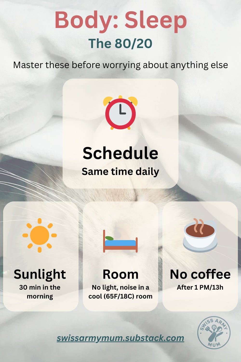 Once you’ve nailed the four fundamentals - consistent schedule, morning light, cool bedroom, caffeine cutoff - you can add more strategies systematically.